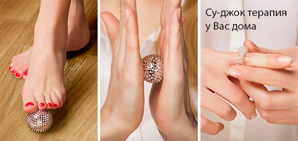 Просто покатайте шарик су джок подошвой ноги или между ладонями, по тыльной стороне кисти или стопы, посжимайте его в кулаке. Кольцом су-джок проработайте каждый палец. По ходу лимфотока кольцо прокатывайте с усилием, а в обратную сторону - ослабьте нажим.